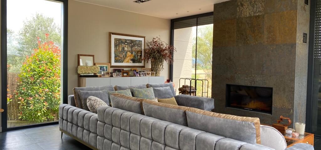 Sofá especial confeccionado con un tejido inglés de microfibra, con un diseño de cubos.
