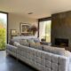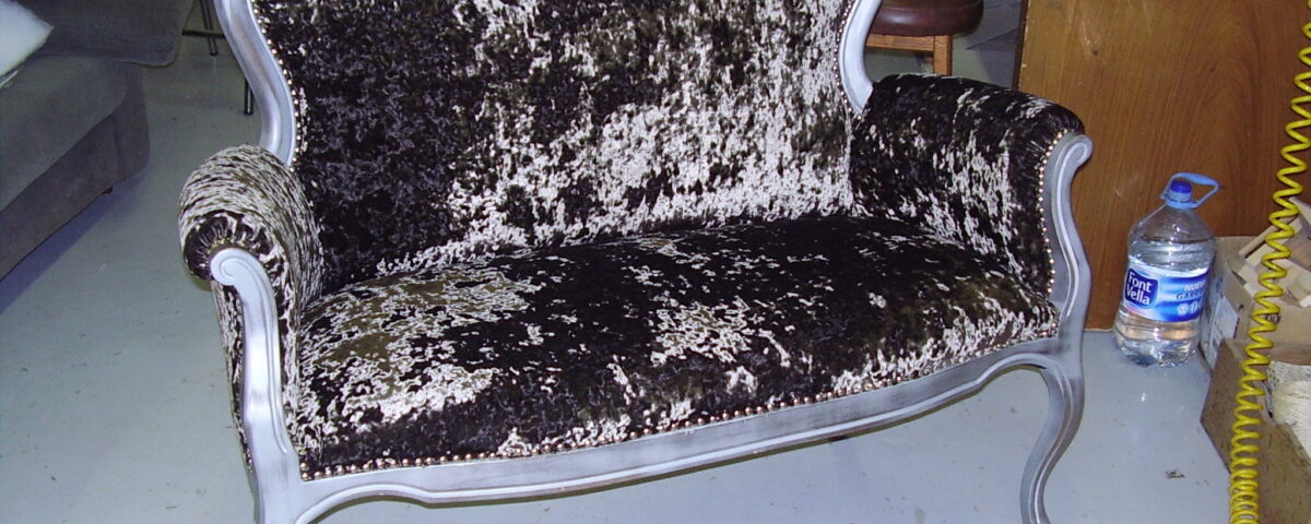 Sofá para la cadena Stradivarius, restaurado con un tejido vintage de terciopelo y lacado con una pintura de color plata.