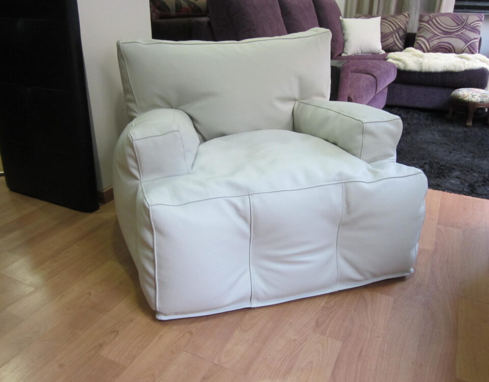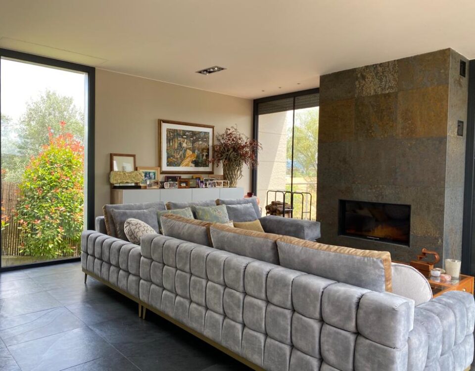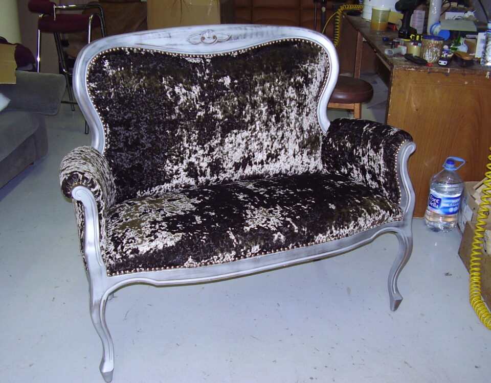Sofá para la cadena Stradivarius, restaurado con un tejido vintage de terciopelo y lacado con una pintura de color plata.